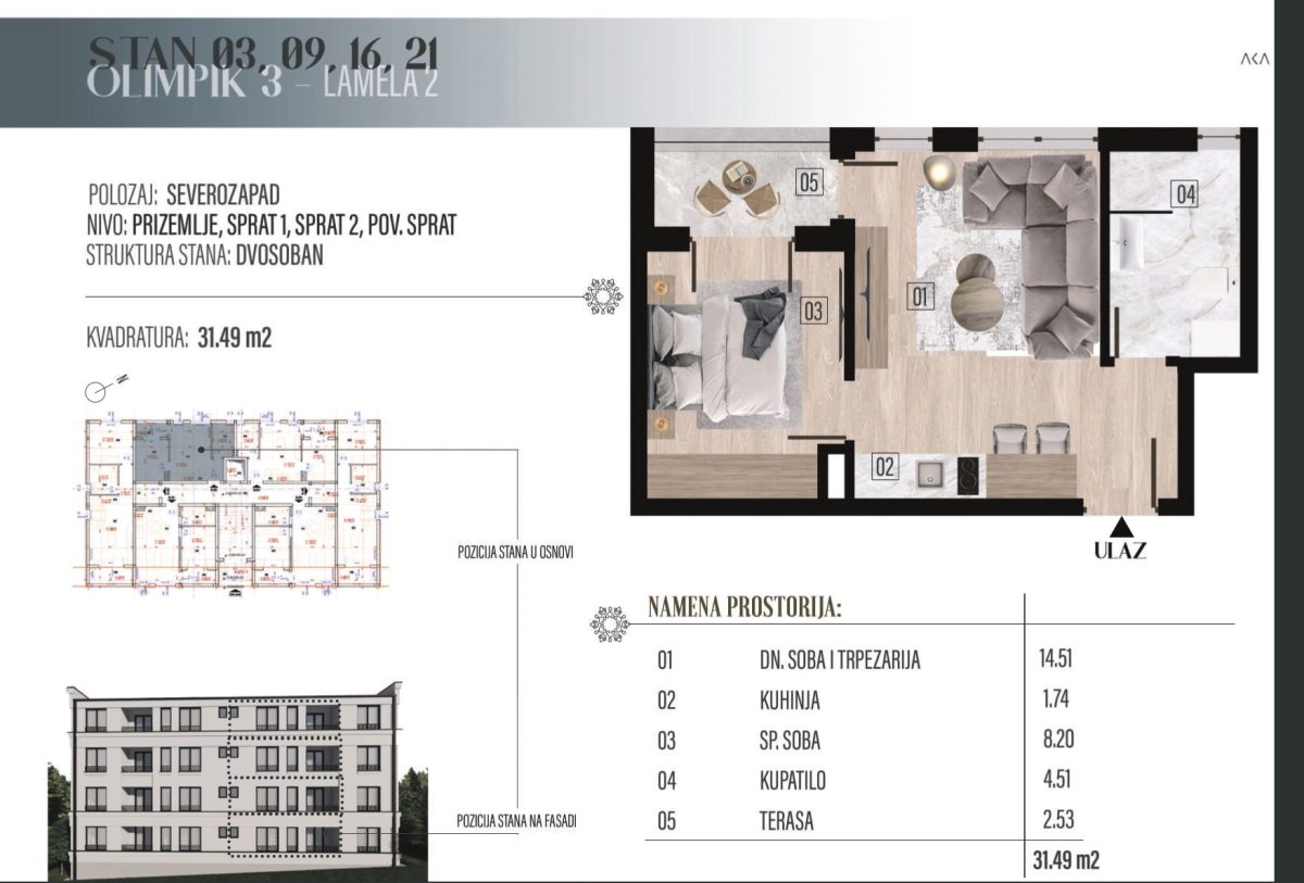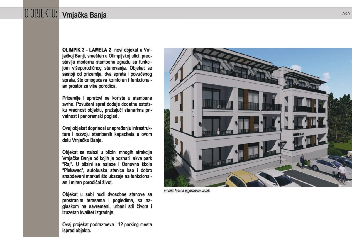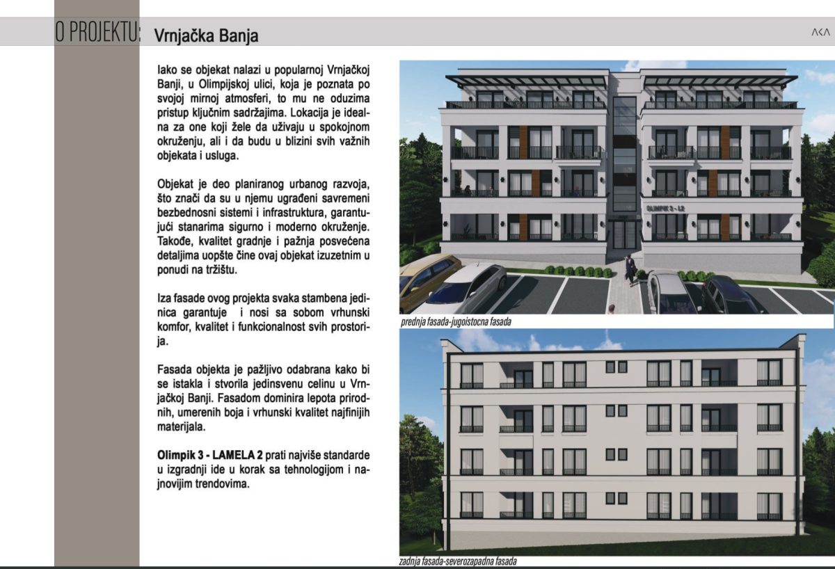 U ponudi su funkcionalni stanovi u zgradi koja je trenutno u izgradnji, na atraktivnoj lokaciji u naselju Raj, nedaleko od Akva parka Raj – jedne od najtraženijih i najlepših zona za život i odmor u Vrnjačkoj Banji.